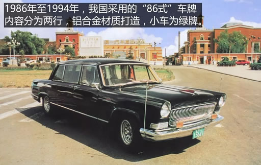 1986年,我国的轿车年产量首次突破1万辆,并且开始允许个人购买私家车,而“86式”车牌也在此时闪亮登场。牌照内容分为两行:上面一行小字由省市区名称+2位数字序号(使馆车为3位数)组成,下面一行大字为5位登记号码。“86式”车牌采用铝合金材质,小车为绿牌,大车为红牌,外籍车为黑牌,教练车、试验车为蓝牌等。