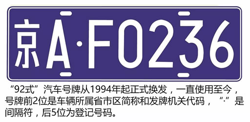 我们如今使用的是1994年开始换发的“92式”汽车号牌,号牌前2位是车辆所属省市区简称和发牌机关代码,中间是间隔符“·”,后5位为登记号码。登记号码的编码规则有三种,第一种全是数字;第二种1位字母(O和I不能使用),其它位为数字;第三种2位字母(O和I不能使用),其它位为数字。