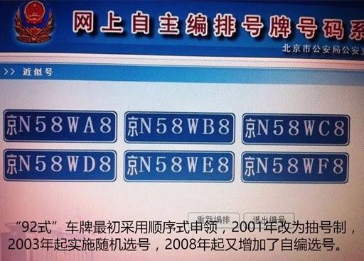 “92式”号牌最初申领时也是按顺序向后排,2001年起,为杜绝人情关系,申领号牌开始施行抽号制,把号码印在密封好的选号卡上,一次发100张,由车主从中抽取后刮开,揭晓号牌。2003年起开始实行微机选号。2008年起,又增加了个性化的自编选号。