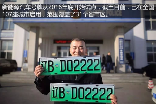 2016年12月起,上海、南京、无锡、济南、深圳5个试点城市率先启用了新能源车号牌。到2017年底,全国已有107座城市启用新能源车号牌,覆盖31个省市区。小型新能源车号牌采用渐变绿色,大型新能源车号牌采用黄绿双拼色。同时增加了专用标识,数字部分由5位升为6位,号牌号码容量增大、资源更加丰富。