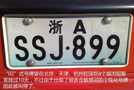 此外,2002年在北京、天津、杭州和深圳4个城市,还曾启动过“02”式号牌的试点工作。车牌采用蓝白彩底,号牌信息分为两层,上层为车辆所属省市区简称和发牌机关代码,下层由6位数字或字母组成,分隔符“·”为前车牌,“-”为后车牌,选号使用自主编排方式。不过,由于出现了不少含敏感词的个性化号牌,“02式”号牌仅发放10天就被叫停了。
